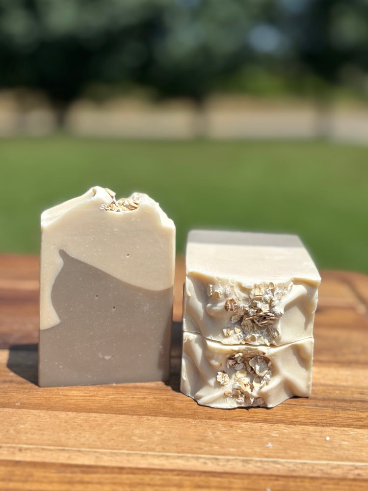 Ingredients: Olea Europaea (Olive Oil), Cocos Nucifera (Coconut Oil), Water, Sodium Hydroxide, Butyrospermum Parkii (Shea Butter), Communis Seed Oil (Castor), Coconut Milk Powder, Colloidal Oats, Whole Oatmeal, Sodium Lactate, White Kaolin Clay, Mica, Fragrance